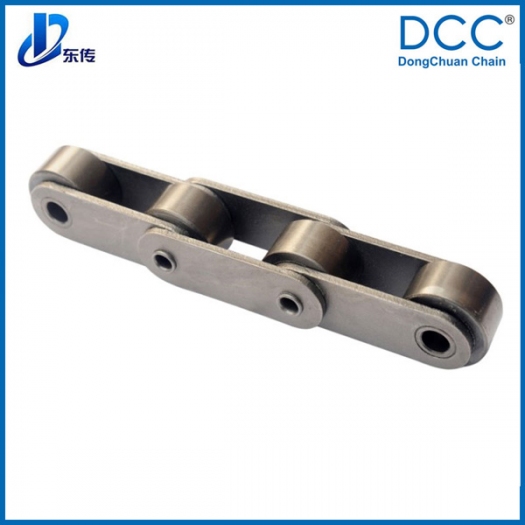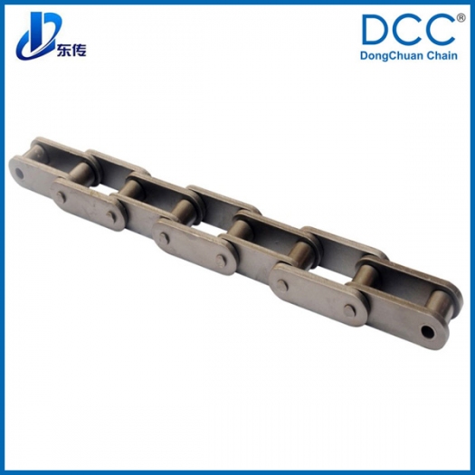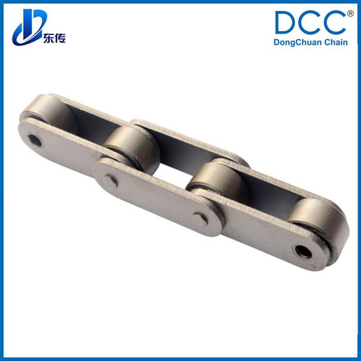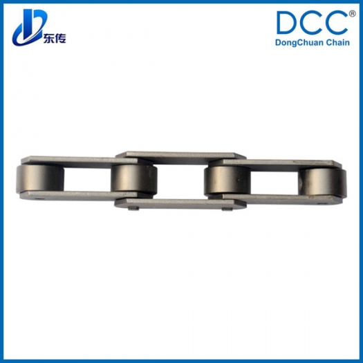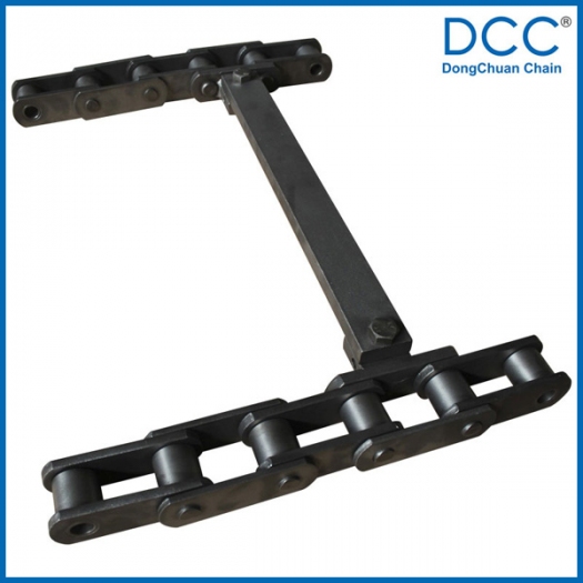 鏈條主要用于工程機(jī)械,鋪路機(jī)使用,鏈條為雙排鏈,在兩鏈條間裝配刮板,我們?cè)谘b配刮板的部位采用焊接工藝,并在鏈板中間沖定位孔,焊接附件用油壓機(jī)壓入鏈板后再進(jìn)行焊接,增強(qiáng)附件的焊接牢固度,中間的刮板用中碳鋼熱處理,使刮板強(qiáng)度更高,更耐磨。并用平面磨床磨平刮板的兩平面,減少鏈條與設(shè)備間的間隙,通過(guò)以上這些工藝措施,鏈條的使用壽命得以大大的提高。